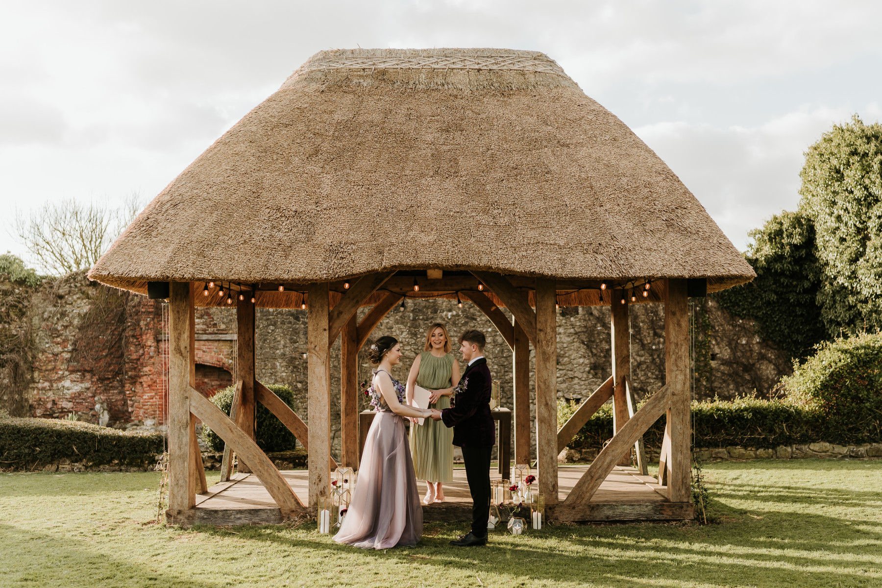 You will have a choice of three stunning licensed ceremony areas. These include the thatched gazebo on the castle lawn, the banqueting hall in the castle, or the bright and spacious marquee.